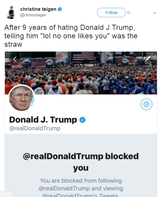 President Trump blocked model Chrissy Teigen from Twitter after she wrote that “lol no one likes you.”