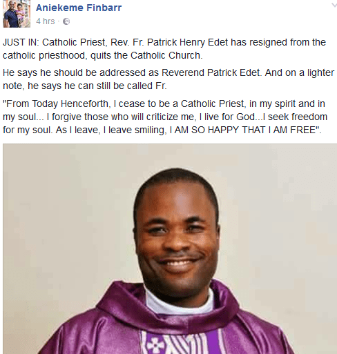 ”JUST IN: Catholic Priest, Rev. Fr. Patrick Henry Edet has resigned from the catholic priesthood, quits the Catholic Church. He says he should be addressed as Reverend Patrick Edet. And on a lighter note, he says he can still be called Fr.
