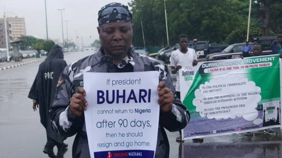 Self-acclaimed area father, Charly Boy, and members of #OurMumuDonDo movement today, led a protest to the entrance of the presidential villa, Abuja, calling for the resignation or immediate return of President Muhammadu Buhari, who has been in the United Kingdom for a medical checkup for over 90 days.