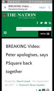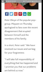 The Nation reports “Peter Okoye of the popular pop-group, PSquare on Thursday apologised to fans over the recent disagreement that erupted between himself and the members of his family.