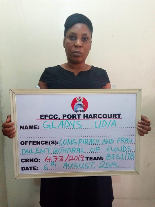 A female banker Gladys Udia, has been docked in Port Harcourt, Rivers State, charged with seven-counts of conspiracy, stealing, forgery and alteration to the tune of N3,476,700.