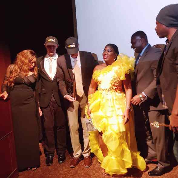Flanked by Nollywood veterans Zik Zulu Okafor and Ejike Asiegbu, #TableShaker Reno, who couldn’t help taking a dig at President Buhari during his acceptance speech, was given a standing ovation as he passionately talked about his #FreeLeahSharibu campaign which he is taking around the world.