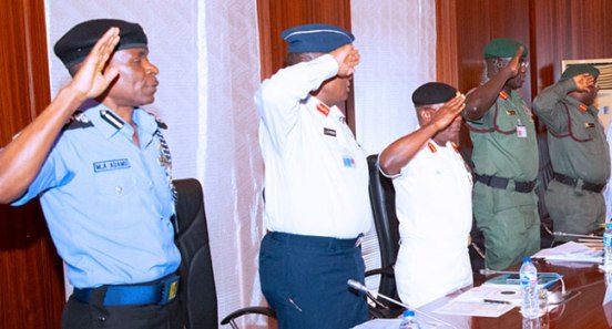 The service chiefs include the Chief of Defence Staff, General Abayomi Olonisakin; Chief of Army Staff, Lieutenant General Tukur Buratai; Chief of Air Staff, Air Marshal Sadique Abubakar; and the Chief of Naval Staff, Ibok Ekwe Ibas.