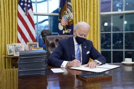 Biden signed executive orders from the Oval Office in the late afternoon.
