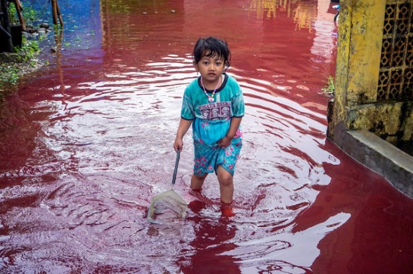 A small Indonesian town briefly turned red after a dye factory was flooded Saturday causing the streets to flow with blood-red water.