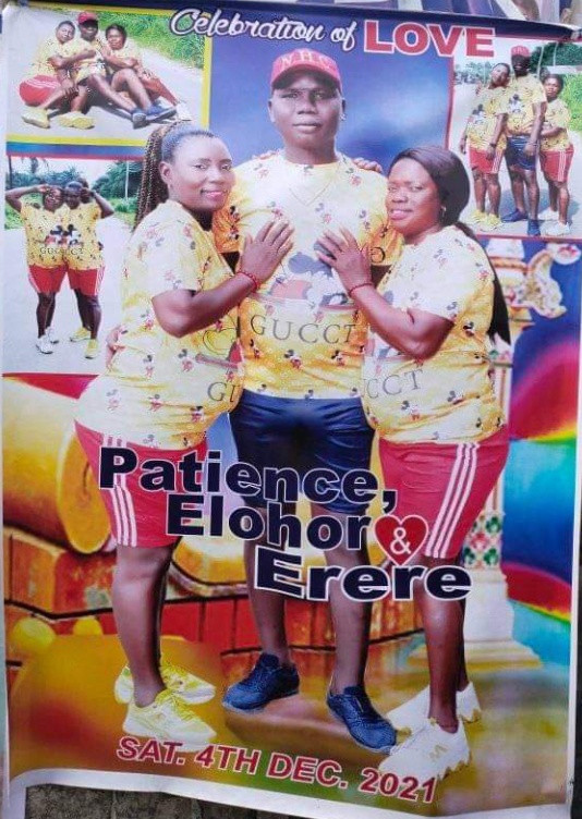 According to the wedding invite, Nana from Orhokpokpo, Agbarho, Ughelli Local Government Area of Delta State will be getting married to Patience and Elohor, both from Udu Local Government Area of Delta on Saturday, December 4, 2021.