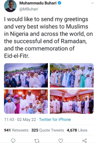 Months after the Federal Government lifted the ban, which lasted till early January, Buhari took to the platform to share photos of himself observing the Eid-el-Fitr prayer with the Muslim faithful at the Mambila Barracks Parade Ground in Abuja.