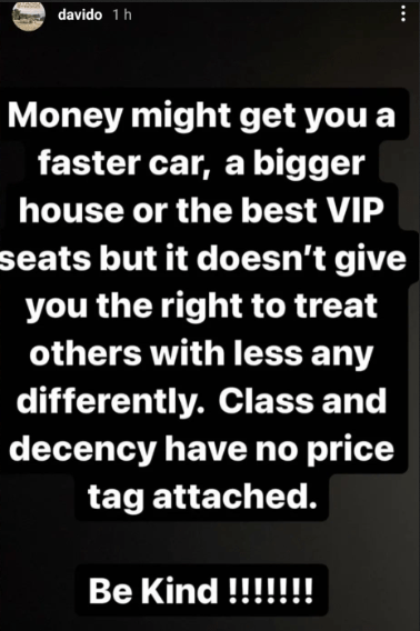 Nigerian singer, Davido on his Insta-story has preached kindness, asking the rich not to treat the poor differently…. Read below;