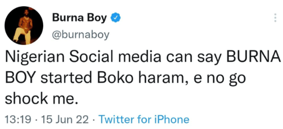 The singer who has been mum ever since the incident happened took to his Twitter account on Wednesday as he simply tweeted, “Nigerian Social media can say BURNA BOY started Boko haram, e no go shock me.”
