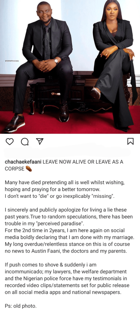 Popular Nollywood actress, Chacha Eke Faani, has announced the end of her nine-year marriage to Austin Faani.