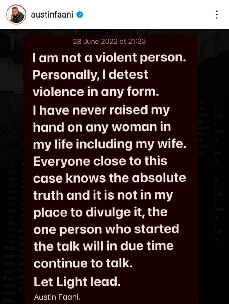 Austin has now reacted. He revealed that he’s not an abusive person and has never raised his hand on any woman, including his wife. Read below: