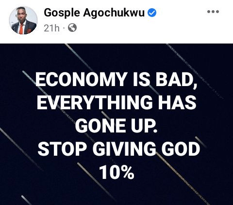 The founder of Shekinah Arena Gospel Ministries, Port Harcourt, who stated this via Facebook on Saturday, July 16, claimed he gives 70% of his income as tithe.