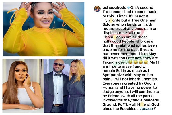 “Y’all true chameleons are those Nollywood people., who knew that this relationship has bee ongoing for the past 6 years but never mentioned it to May until it was too late, now they’re taking sides. Me! I am true to myself so I will remain so! In as much as I sympathise with May on her pain, I will not inherit enemies.