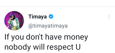 Nigerian singer, Timaya has said that nobody respects people who don’t have money.