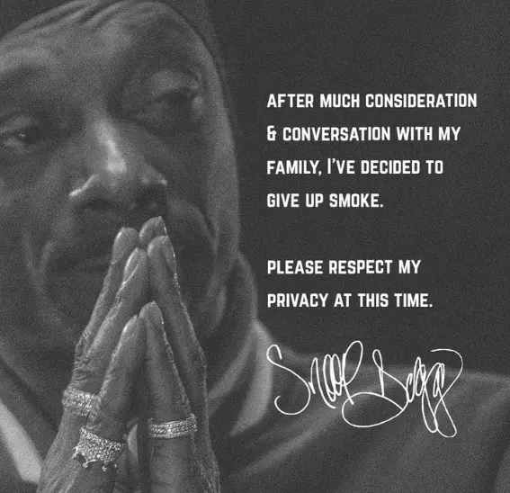 The post shared Thursday on Snoop Dogg’s Instagram reads “After much consideration and conversation with my family, I’ve decided to give up smoke.