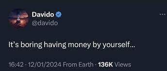 Afrobeats star, Davido has stirred up a conversation about wealth noting that “it’s boring having money by yourself.”