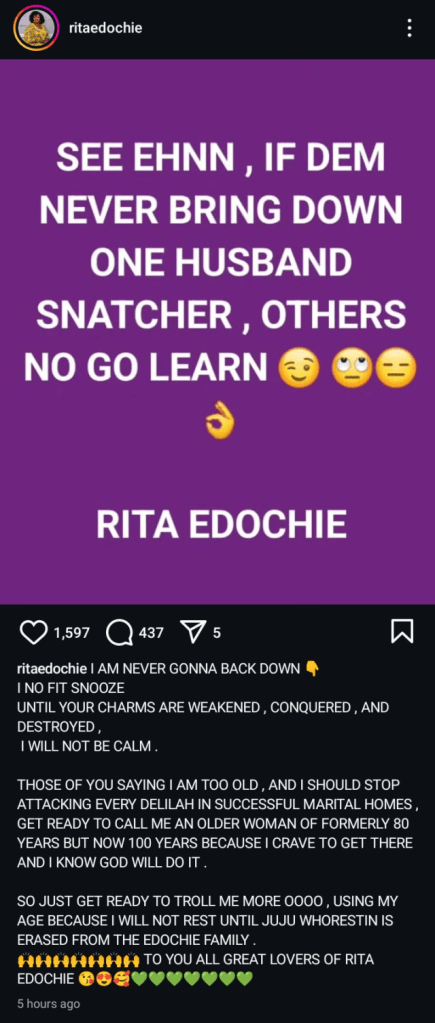 Rita Edochie’s post was a passionate declaration of her commitment to defending May Edochie, Yul Edochie’s estranged wife. May Edochie has been at the center of a highly publicized marital crisis, and Rita Edochie has been a vocal supporter of her throughout the ordeal.