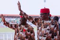 President Buhari in his Isiagu attire, calls for unity in Nigeria, promises more projects for South East